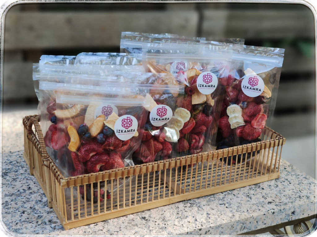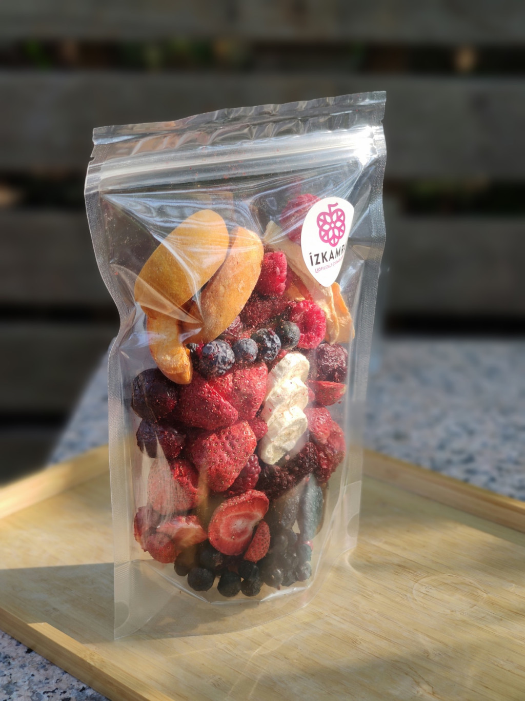A liofilizált gyümölcsök az eljárásnak köszönhetően teljes egészében megőrzik a vitamin és ásványi anyag tartalmukat. Nem tartalmaz tartósítószert, minden mentes termék. A válogatásban 9 féle gyümölcs van: szamóca, szeder, szilva, sárgabarack, sárgadinnye, piros ribizli, fekete ribizli, bekete berkenye, áfonya