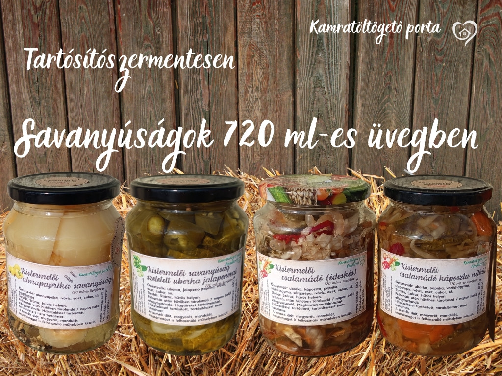 Almás-hagymás céklasaláta (édeskés) Nettó tömeg: 660 g Összetevők: cékla, alma, vöröshagyma, ivóvíz, ecet, cukor, só, fűszerek: fekete bors, babérlevél. Csemeguborka-savanyúság Nettó tömeg: 720 g Összetevők: uborka, ivóvíz, ecet, cukor, só, kapor, babérlevél, fekete bors, mustármag Felbontás után hűtőben tárolandó 7 napon belül elfogyasztandó. Hőkezeléssel tartósított, tartósítószert nem tartalmaz. A termék diót, mogyorót, mandulát, mustármagot is felhasználó műhelyben készült.