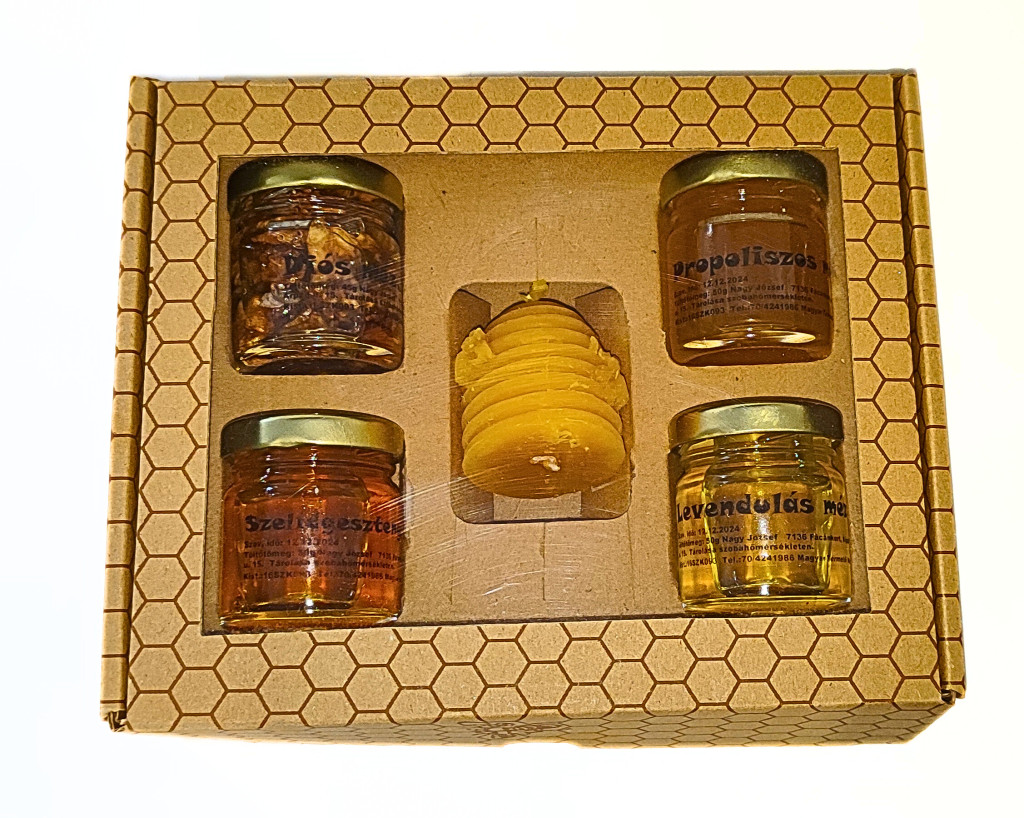 Díszdobozos méz Ajándékcsomag – Egyedi Választási Lehetőséggel Lepje meg szeretteit egy különleges díszdobozos méz ajándékcsomaggal, amely a természet legfinomabb kincseit rejti! A dobozban válogatott mini mézek találhatók, és mellé egy méhviasz gyertya is társul. Vásárlóink számára egyedülálló lehetőséget biztosítunk: Ön választhatja ki, hogy melyik mini mézfajtákat és milyen formájú méhviasz gyertyát szeretne a díszdobozba helyezni, így valóban személyre szabott ajándékot hozhat létre. A Díszdoboz Tartalma: Mini mézek: 50g- os mézek : levendulás méz, propoliszos méz , akácméz, diós méz Méhviasz gyertya: Méhkas forma méhviasz gyertya Tökéletes választás ünnepi alkalmakra, születésnapokra vagy akár csak egy kis kényeztetésként mindennapi fogyasztásra. A természetes összetevők és a gondos csomagolás garantálja a prémium minőséget. Miért Válassza a Díszdobozos mézet? A díszdobozos méz ajándék nemcsak a mézek és gyertyák kedvelőinek okoz örömöt, de az otthonokban is kiváló díszítőelem. A méhviasz gyertya természetes illatával nyugalmat és harmóniát áraszt.