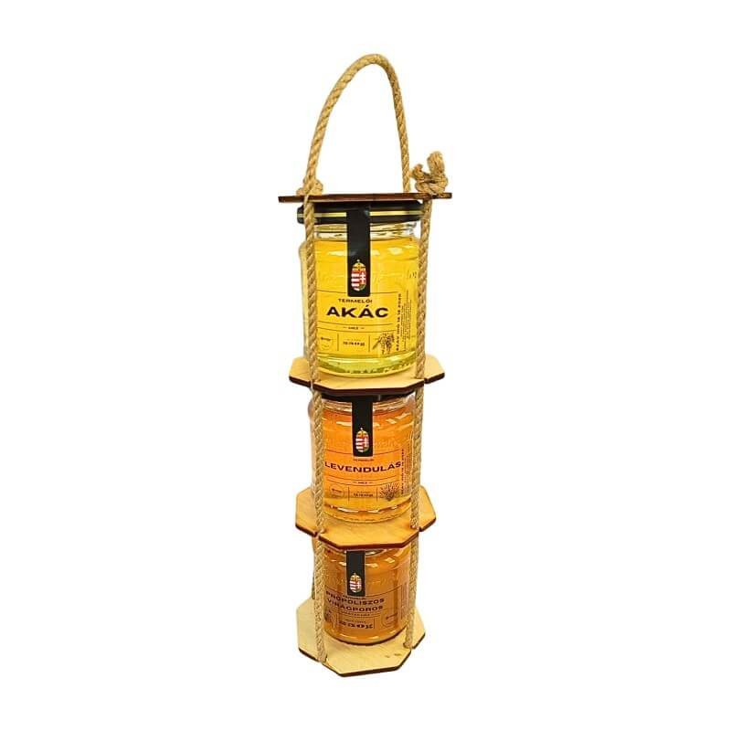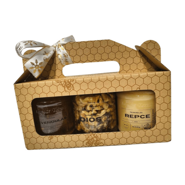 Díszdobozos Mézválogatás 3×250 g – Prémium, Ajándéknak is Tökéletes A díszdobozos mézválogatás három különleges mézfajtát egyesít elegáns csomagolásban. A gondosan összeállított válogatás azoknak készült, akik szeretnék megismerni a mézek sokszínű ízvilágát, vagy prémium ajándékot keresnek természetes, értékes összetevőkkel. Mit tartalmaz a csomag? A doboz három darab, 250 g-os üveg mézet foglal magában, az alábbi összeállításban: Akácméz – lágy, édes ízvilágú klasszikus különlegesség Levendulás méz – aromás, virágos ízű mézkülönlegesség Propoliszos méz – értékes, természetes hatóanyagokkal gazdagított méz A válogatás egyensúlyban hozza a kellemesen édes, aromás és karakteres mézeket, így minden alkalomra ideális. Miért jó választás ez a mézválogatás? Elegáns ajándék – prémium díszdoboz, amely bármilyen alkalomra tökéletes Három különböző íz egy csomagban – változatos élményt nyújt, mézkedvelőknek különösen ajánlott Termelői minőség – gondosan készített, adalékanyagmentes, természetes mézek Látványos megjelenés – dekoratív ajándék, amely minden konyhában jól mutat
