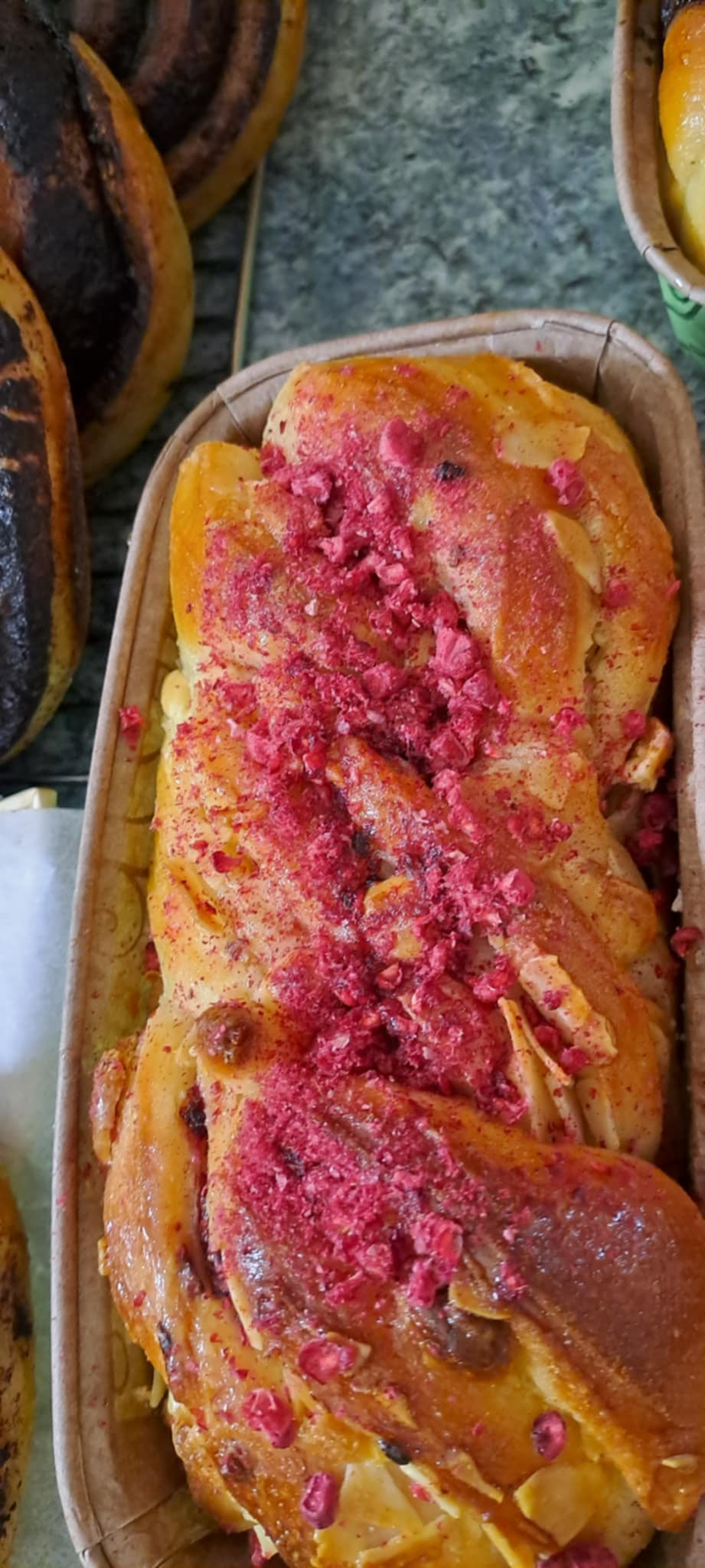 Tartalmaz: Bl55 búzaliszt, tej tojás, vaj, kovász , mandula, fehércsoki, (tetejére dízités liofilizált málna/eper)