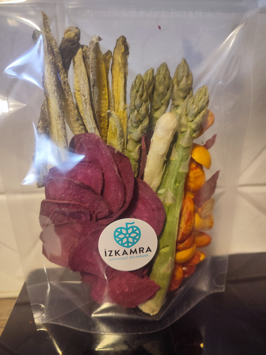 A csomag tartalma spárga, koktél paradicsom, cékla chips, kovászos uborka. A spárga a tavasszal megjelenő első rügy, mely tele van vitamminnal, jótékony hatása van szervezetünkre. A liofilizálás során ezek a beltartalmak teljes mértékben megmaradnak. Felhasználható zöld salátához, tésztasalátához de egészséges ropogtatni való is lehet. A liofilizált vagy fagyasztva szárított paradicsom megtartja a nyári gyümölcs beltartalmát és ízvilágát. Salátákra, szendvicsekre használható mint a friss paradicsom de fűszerként is kiválló. A liofilizált cékla a nyers cékla minden beltartalmával rendelkezik, egészséges zöldség chips. A liofilizált kovászos uborka, természetes kovászolással készítjük, majd a hosszú távú tartósítást fagyasztva szárítással végezzük. A eredmény egy különleges ropogós kovászos uborka, melyet tehetsz szedvicsre, salátára használhatód fűszerezésre.