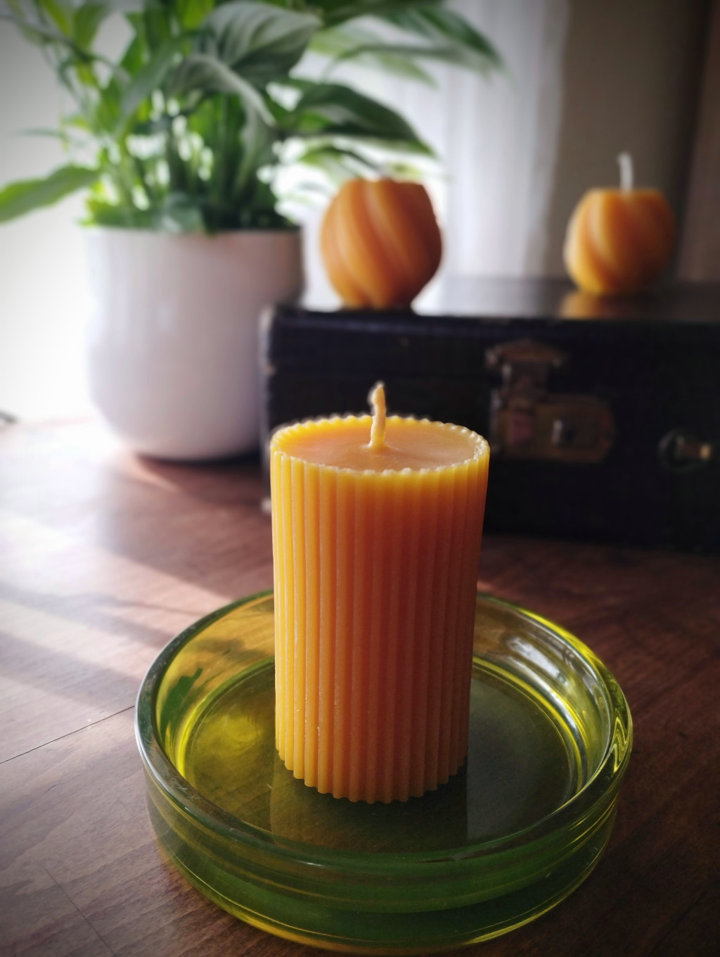 Közepes méretű bordázott henger gyertya 100% méhviasz gyertya saját méhészetünkből, amely természetes, meleg fényével és kellemes illatával beragyogja a mindennapokat. Alapanyagát, a méhviaszt a méhek termelik, így 100%-ban természetes és környezetbarát anyag. A méviasz gyertya továbbá azért is környezetbarát választás, mert égéskor nem bocsát ki káros vegyi anyagokat, így nem terheli az éltterünk levegőjét. Hoszabb ideig ég mint más gyerták, és tisztán ég - nem csöpög, nem füstöl - ezáltal is kellemesebb a használata. A méhviasz gyertya fénye meleg, a napfényhez hasonló árnyalatú. Ez a meleg fény nem csupán a jó hangulatot fokozza, nyugtató hatású testre és lélekre egyaránt: lassít, ellazít, és segít elcsendesedni amikor szeretnénk egy kicsit kiszabadulni a vibráló, felgyorsult világból. Mérete: 80 mm (m), 50 mm (sz). Súlya kb. 130 gramm.