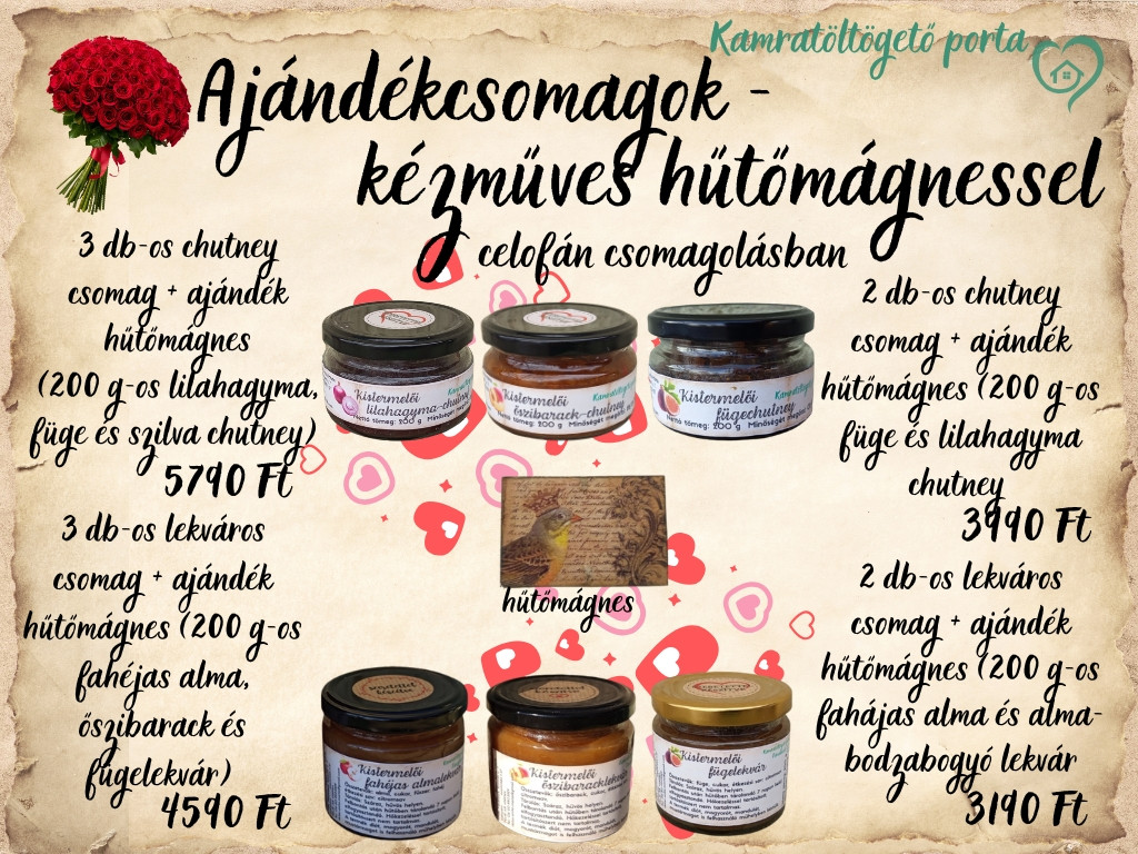 Ajándékcsomagok celofán csomagolásban 3 db-os chutney csomag + ajándék kézműves hűtőmágnes Tartalma: 200 g-os szilva, füge, lilahagyma chutney + hűtőmágnes 2 db-os chutney csomag + ajándék kézműves hűtőmágnes Tartama: 200 g-os füge és lilahagyma chutney + hűtőmágnes 3 db-os lekváros csomag + ajándék kézműves hűtőmágnes Tartalma: 200 g-os fahéjas alma, őszibarack és füge lekvár + hűtőmágnes 2 db-os lekváros csomag + ajándék kézműves hűtőmágnes Tartalma: 200 g-os fahéjas alma és alma-bodzabogyó lekvár