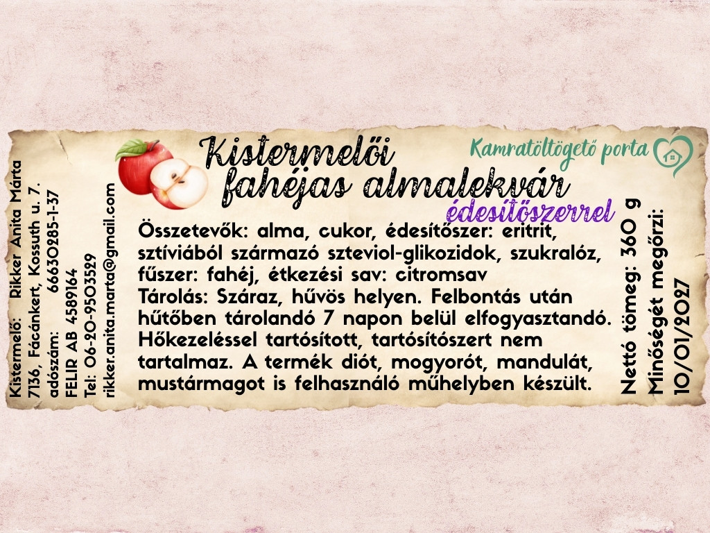 Összetevők: alma, cukor, édesítőszer: eritrit, sztíviából származó szteviol-glikozidok, szukralóz, fűszer: fahéj, étkezési sav: citromsav Tárolás: Száraz, hűvös helyen. Felbontás után hűtőben tárolandó 7 napon belül elfogyasztandó. Hőkezeléssel tartósított, tartósítószert nem tartalmaz. A termék diót, mogyorót, mandulát, mustármagot is felhasználó műhelyben készült. Nettó tömeg: 360 g