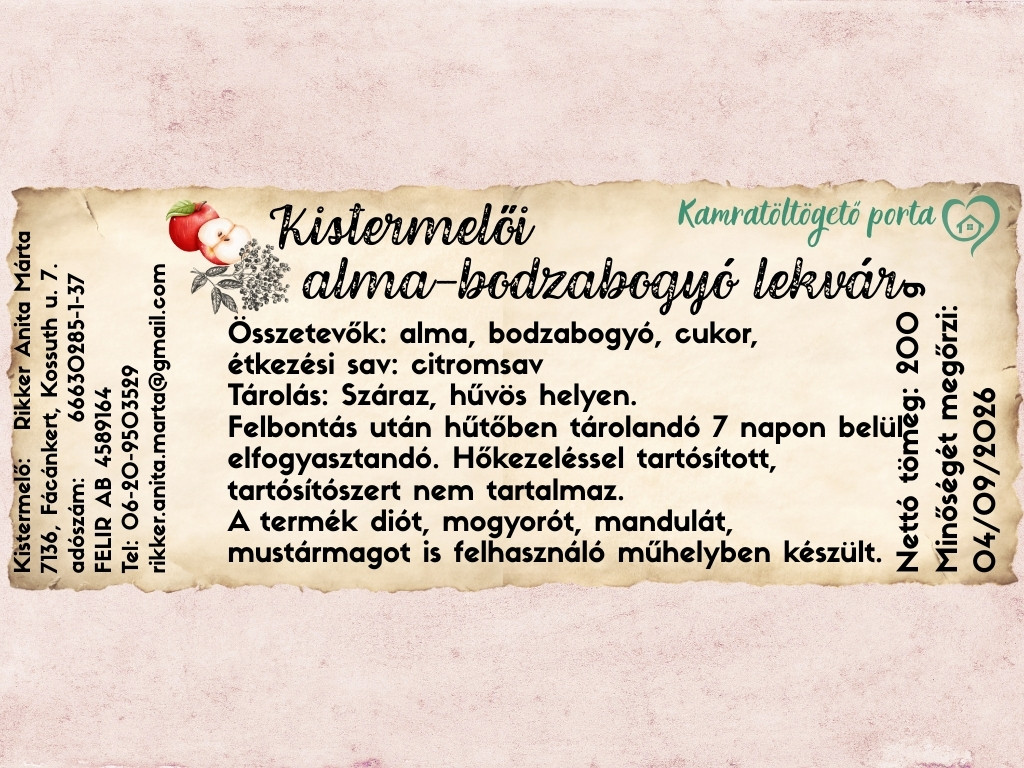 Összetevők: alma, bodzabogyó, cukor, étkezési sav: citromsav Tárolás: Száraz, hűvös helyen. Felbontás után hűtőben tárolandó 7 napon belül elfogyasztandó. Hőkezeléssel tartósított, tartósítószert nem tartalmaz. A termék diót, mogyorót, mandulát, mustármagot is felhasználó műhelyben készült.