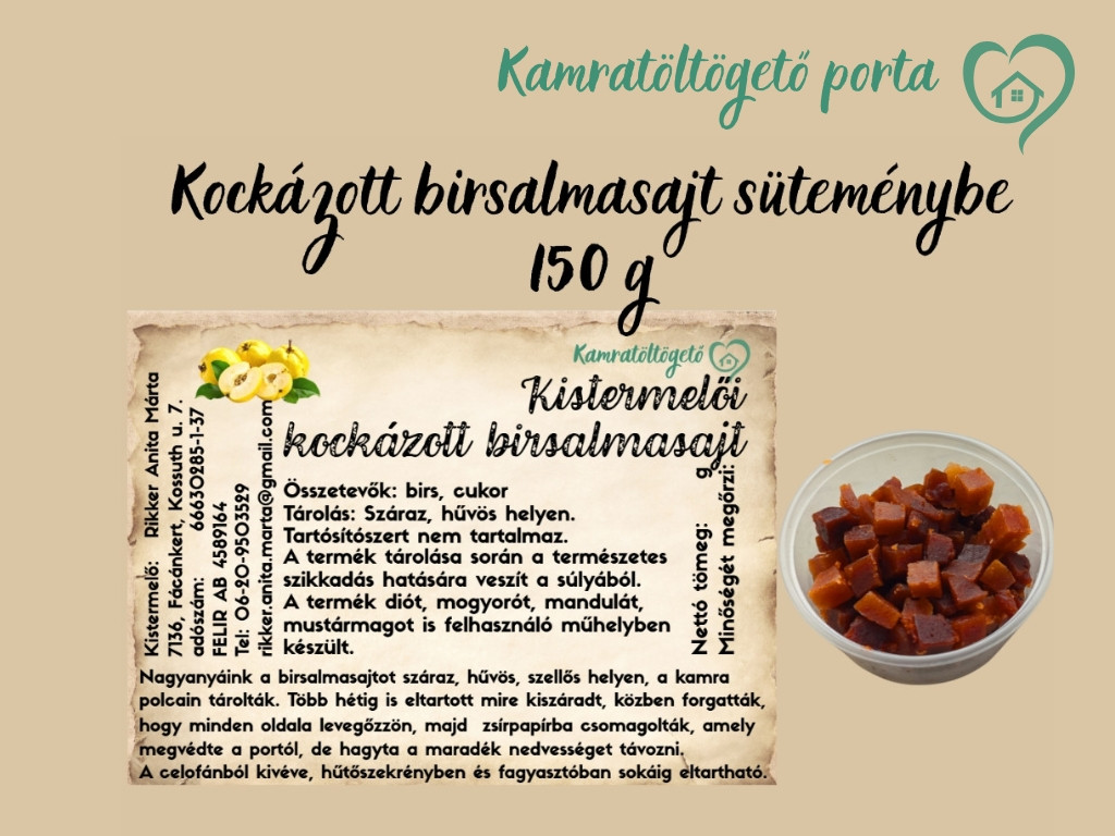 Kockázott birsalmasajt 150 g (tégelyben) Kockázott birsalmasajt süteménybe ajánlott. Nettó tömeg: 150 g Összetevők: birsalma, cukor Tárolás: Száraz, hűvös helyen. Tartósítószert nem tartalmaz. A termék tárolása során a természetes szikkadás hatására veszít a súlyából. A termék diót, mogyorót, mandulát, mustármagot is felhasználó műhelyben készült. Nagyanyáink a birsalmasajtot száraz, hűvös, szellős helyen, a kamra polcain tárolták. Több hétig is eltartott mire kiszáradt, közben forgatták, hogy minden oldala levegőzzön, majd zsírpapírba csomagolták, amely megvédte a portól, de hagyta a maradék nedvességet távozni. A csomagolásból kivéve, hűtőszekrényben és fagyasztóban sokáig eltartható.