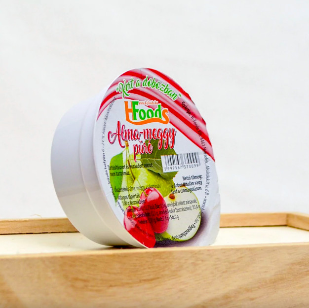 A H-foods gyümölcspürék alapja a gondosan válogatott alma, melyet hőkezelés előtt, finoman rövid ideig sütjük, így a benne lévő cukortartalom enyhén karamellizálódik, ez adja a termék alap édeskés ízét. A termékben lévő másik gyümölcs püré íze , pedig harmonikusan illeszkedik mindehhez, mindez ízfokozó, színezék, tartósítószer és hozzáadott tartósítószer nélkül. Vitaminokban és ásványi anyagokban gazdag , egészséges élelmiszer, ezért nem csak babaáknak, gyermekeknek, hanem diétázók, sportolók is szívesen választják étrendjük kiegészítőjének. Változatosságot adhat a reggeli müzli vagy smoothie elkészítésénél, uzsonnára deszertként, délutáni nasinak vagy akár vacsorára is fogyaszthatjuk. De nagyszerű alapanyag levesek, mártások, sütemények elkészítéséhez. Paleo étrendbe is beilleszthető. Összetevők: alma, meggy Átlagos tápérték 100g termékben: Energia: 221 KJ / 52,7 kcal Zsír 0,1g, -melyből telített zsírsavak
