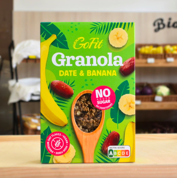 GLUTÉNMENTES termék Hozzáadott cukor és édesítőszer nélkül Természetesen édes granola ropogós zabpehellyel, banánnal és zamatos datolyával. A gyümölcsök adják meg az ízét, így nincs benne hozzáadott cukor vagy édesítőszer – csak tiszta, természetes alapanyagok. Ideális reggelire joghurttal, tejjel vagy akár önmagában ropogtatnivalóként. Elkészítési javaslat: tejjel, joghurttal, smoothie feltétként, de önmagában is fogyasztható. Gluténmentes zabpehely (61%), datolya (( 22%) datolyakocka, datolya por, datolya sűrítmény ) növényi rost, hántolt napraforgómag, banán sűrítmény ( 8%) napraforgó olaj, természetes aroma, só, Mogyorót, dióféléket is feldolgozó üzemben készül. Energia KJ : 1624, 3 Kcal: 386, 8 Zsír: 13,2g, - telített zsír : 2,7g, Szénhidrát: 49,9g - amelyből cukor: 8,1g, Fehérje: 10g, Rost : 12g, só: 10g Gyártó: GOF Hungary Kft. - Nyíregyháza GLUTÉNMENTES ZABFELDOLGOZÓ ÜZEM