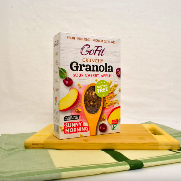 A gluténmentes prémium zabpehelyből, valódi gyümölcsökkel, hozzáadott cukor nélkül készült, fahéjjal ízesített ropogós, rostban gazdag készítmény fogyasztható bármely napszakban (ajánlottan reggel) étkezésként vagy annak kiegészítésére. A finom, ropogós keverék nem csak reggeli, hanem szuper-egészséges nassolnivaló is lehet. A természetes összetevőkből, és a superfoodnak minősülő kiváló minőségű zabpehelyből készült étel kiváló eledel a sportolóknak, egészségtudatos táplálkozóknak, vegánoknak. Mogyorót, dióféléket is feldolgozó üzemben készül. Gluténmentes zabpehely (59,5%), meggy készítmény (meggysűrítmény, aszalt meggy szemek) (10 %), alma készítmény (almasűrítmény, szárított almakocka, almapor) (9,8 %), édesítőszer (eritrit, szteviol-glikozidok), hántolt napraforgó mag, növényi rost (csicseriborsó, kukorica), napraforgó olaj, ceyloni fahéj, természetes aroma, só Energia KJ : 1458 Kcal: 346 Zsír: 11,7g, - telített zsír : 1,8 g, Szénhidrát: 50,4 g - amelyből cukor: 10,6 g, Fehérje: 10, 7g, Rost : 14 g, só: 0,28 g Gyártó: GOF Hungary Kft. - Nyíregyháza GLUTÉNMENTES ZABFELDOLGOZÓ ÜZEM