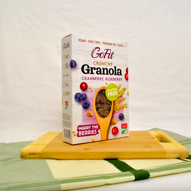 A gluténmentes prémium zabpehelyből, valódi kék és vörösáfonyával készült, juharsziruppal ízesített, rostban gazdag, ropogós készítmény fogyasztható bármely napszakban (ajánlottan reggel) étkezésként vagy annak kiegészítésére. A finom, ropogós keverék nem csak reggeli, hanem szuper-egészséges nassolni való is lehet. A természetes összetevőkből, és a superfoodnak minősülő kiváló minőségű zabpehelyből készült étel kiváló eledel a sportolóknak, egészségtudatos táplálkozóknak, vegánoknak. Gluténmentes zabpehely (62%), fruktóz, hántolt napraforgó mag, kandírozott vörösáfonya (6%), napraforgó olaj, kékáfonya sűrítmény (3,5%), szárított juharszirup, inulin, természetes aroma, só Energia KJ : 1601 Kcal: 381 Zsír: 11,5g, - telített zsír : 1,7 g, Szénhidrát: 52,7 g - amelyből cukor: 20 g, Fehérje: 10,2g, Rost : 10,8 g, só: 0,25 g Gyártó: GOF Hungary Kft. - Nyíregyháza GLUTÉNMENTES ZABFELDOLGOZÓ ÜZEM