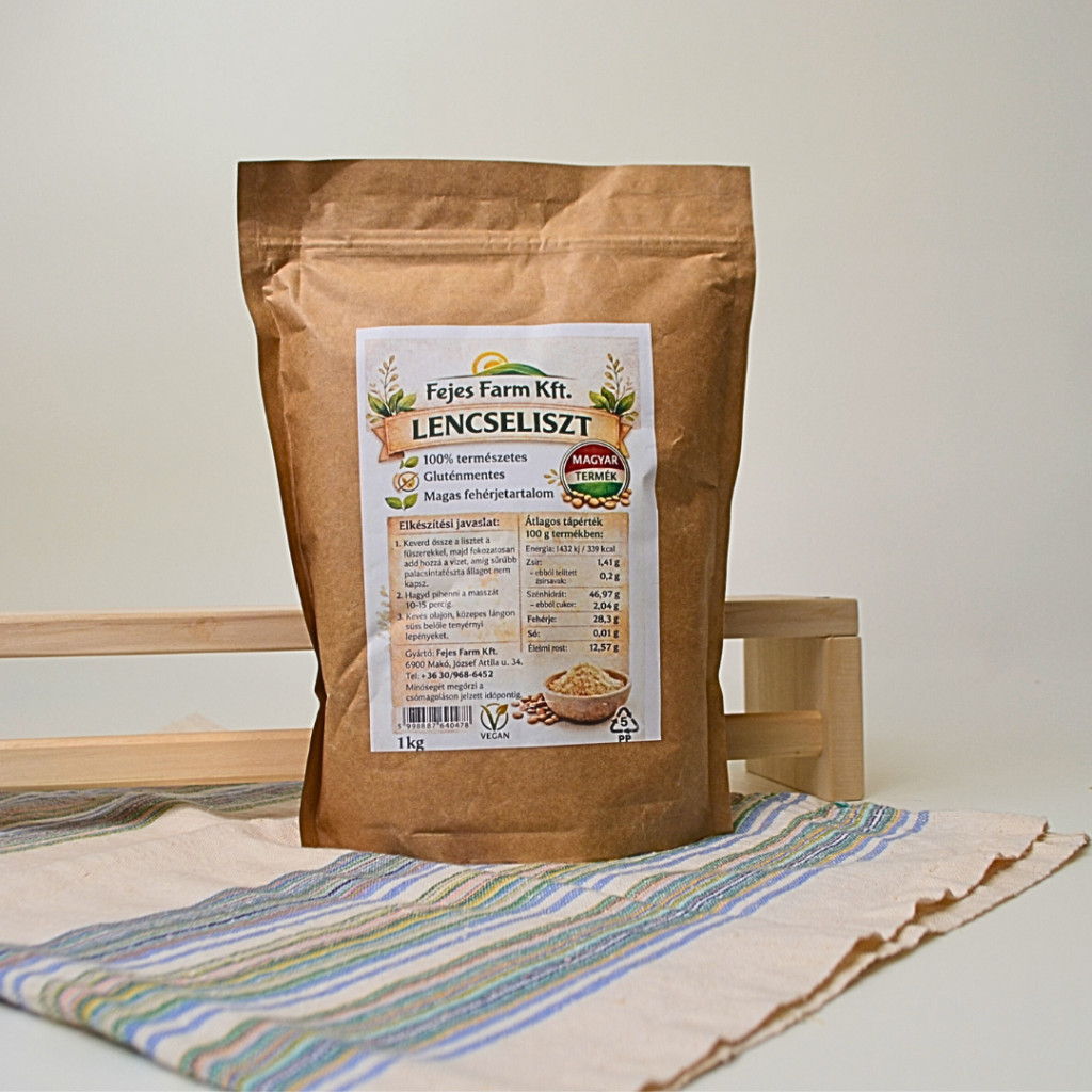 A lencsliszt felhasználhatósága: A lencseliszt egy rendkívül tápláló, gluténmentes alternatíva a hagyományos gabonalisztek helyett. Magas fehérjetartalma miatt ideális vegán és vegetáriánus étrendhez. Alacsony glikémiás indexű, ezért lassabban szívódik fel, így nem dobja meg hirtelen a vércukorszintet. B-vitaminokban és ásványi anyagokban gazdag: Különösen vasat, magnéziumot és folsavat tartalmaz nagy mennyiségben. Használható főzelékek, levesek és szószok sűrítésére ( nem csomósodik ) Lepény készítésére ( recept a csomagoláson ) Húsok vagy zöldségek panírozásához is használható, ropogósabb réteget ad Magas fehérjetartalma miatt jól tart, de érdemes más lisztekkel (pl. rizsliszt, zabliszt) keverni a lágyabb állagért. Összetevők: lencseliszt Energia 1432kj / 339 kcal Zsír 1,41g: - ebből telített zsírsavak 0,2g, Szénhidrát 46,97 g - ebből cukor: 2,04g, Fehérja: 28,3 g, Só: 0,01g, Elemi rost : 12, 57g Termelő: FejesFarm Kft - Makó