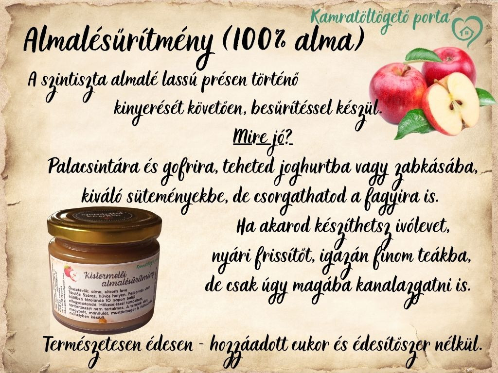Almalésűrítmény Nettó tömeg: 200 g Összetevők: alma, citrom leve Tárolás: Száraz, hűvös helyen. Felbontás után hűtőben tárolandó 10 napon belül elfogyasztandó. Hőkezeléssel tartósított, tartósítószert nem tartalmaz. A termék diót, mogyorót, mandulát, mustármagot is felhasználó műhelyben készült.