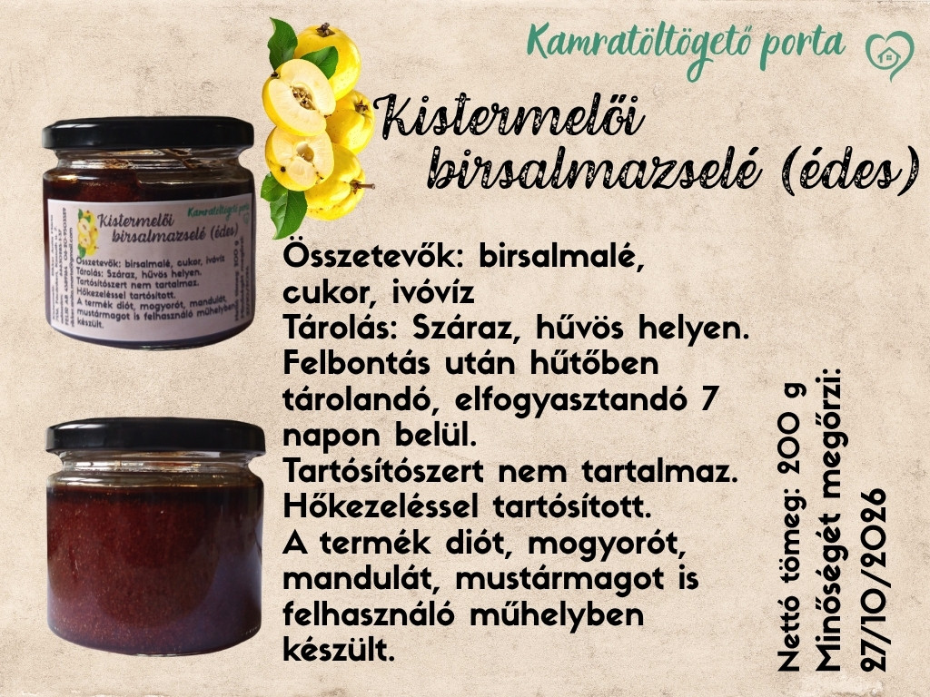 Összetevők: birsalmalé, cukor, ivóvíz Nettó tümeg: 200 g Tárolás: Száraz, hűvös helyen. Felbontás után hűtőben tárolandó, elfogyasztandó 7 napon belül. Tartósítószert nem tartalmaz. Hőkezeléssel tartósított. A termék diót, mogyorót, mandulát, mustármagot is felhasználó műhelyben készült.