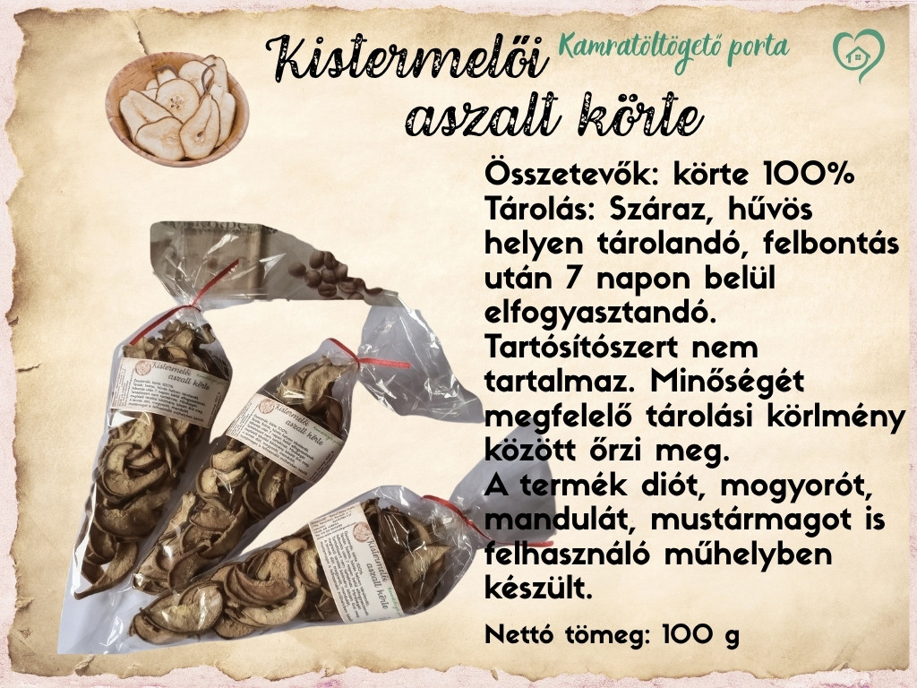 Nettó tömeg: 100 g Összetevők: körte 100% Tárolás: Száraz, hűvös helyen tárolandó, felbontás után 7 napon belül elfogyasztandó. Tartósítószert nem tartalmaz. Minőségét megfelelő tárolási körlmény között őrzi meg. A termék diót, mogyorót, mandulát, mustármagot is felhasználó műhelyben készült.