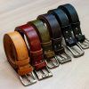 Az általam készített derékszíjak közös jellemzője, hogy 3,5-4 mm vastag, egy rétegű, szín marhabőrből készülnek. Minden derékszíjra ÖT ÉV GARANCIÁT vállalok. Széles csat kínálatból választhat. Minden övhöz két darab kézzel varrott bújtató tartozik: egy közvetlenül a csat mögött, illetve egy csúszó bújtató, amely az öv végét tartja. Fekete színben 180 cm hosszúságig tudok övet készíteni, a többi szín általában 150-160 cm-ig elérhető.
