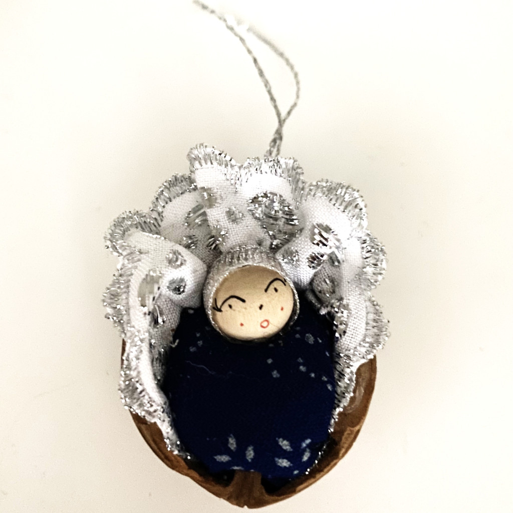 Eredeti kékfestő anyagunkból készült dióbaba, ezüst csipke díszítéssel.