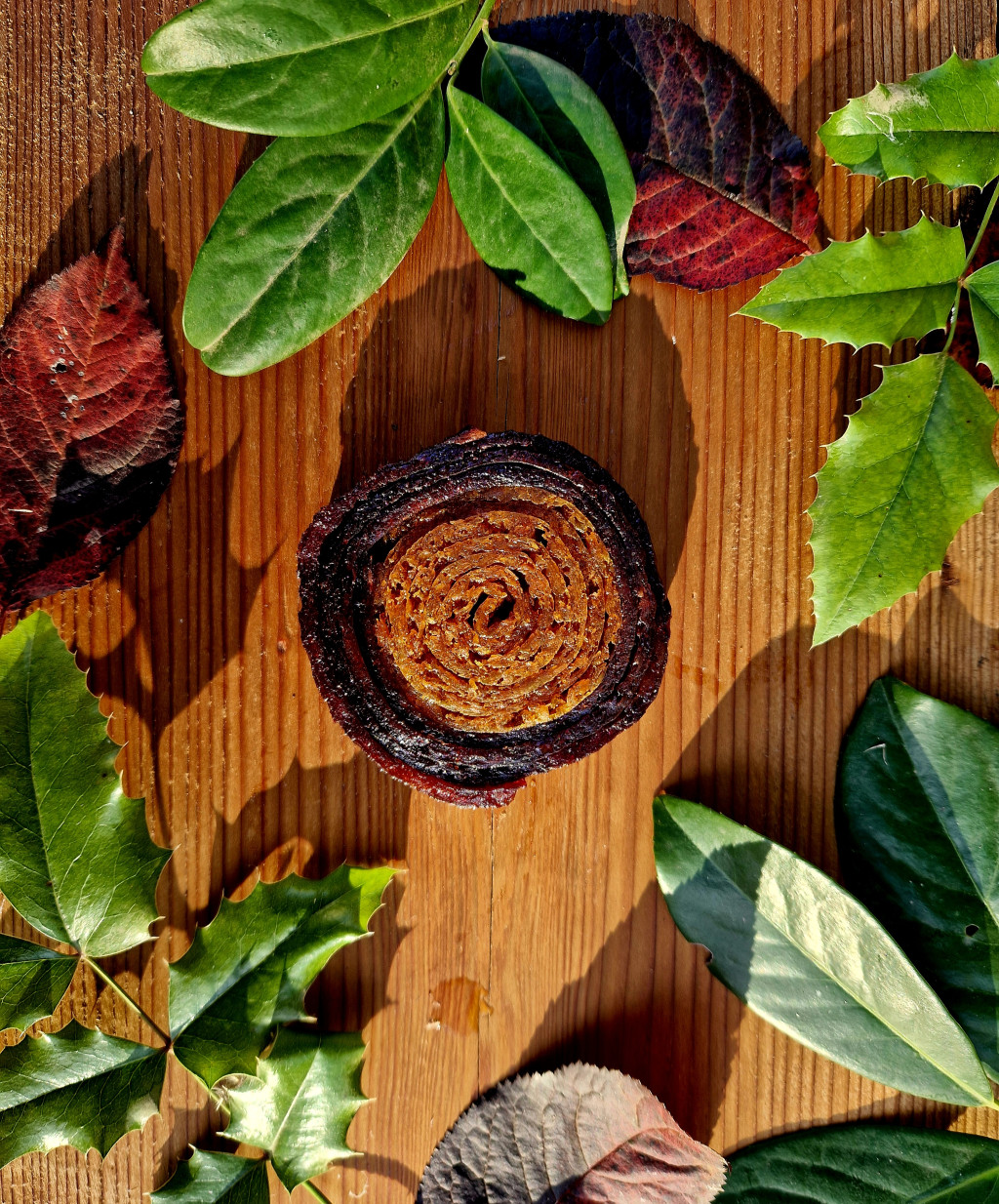 Aszalt gyümölcs játékos formában Belül mézes sárgabarack aszalvány található, köré pedig egy "csík" mézes szilva tekeredik. A kettő csak együtt vásárolható, mindkét íz tesz ki egy darab terméket. Kézműves jellegéből fakadóan a méretek eltérhetnek, kb 50-70 gramm között mozog egy tekercs aszalvány súlya. Összetevők: sárgabarack, méz szilva, méz