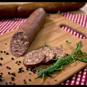Bácskai májas hurka. Összetétel: sertés máj, sertés hús sertés belsőség, sertés zsír-főve. Só, bors, majoranna, kömény.szegfűbors, csemege paprika, fokhagyma, vöröshagyma.Füstölt.