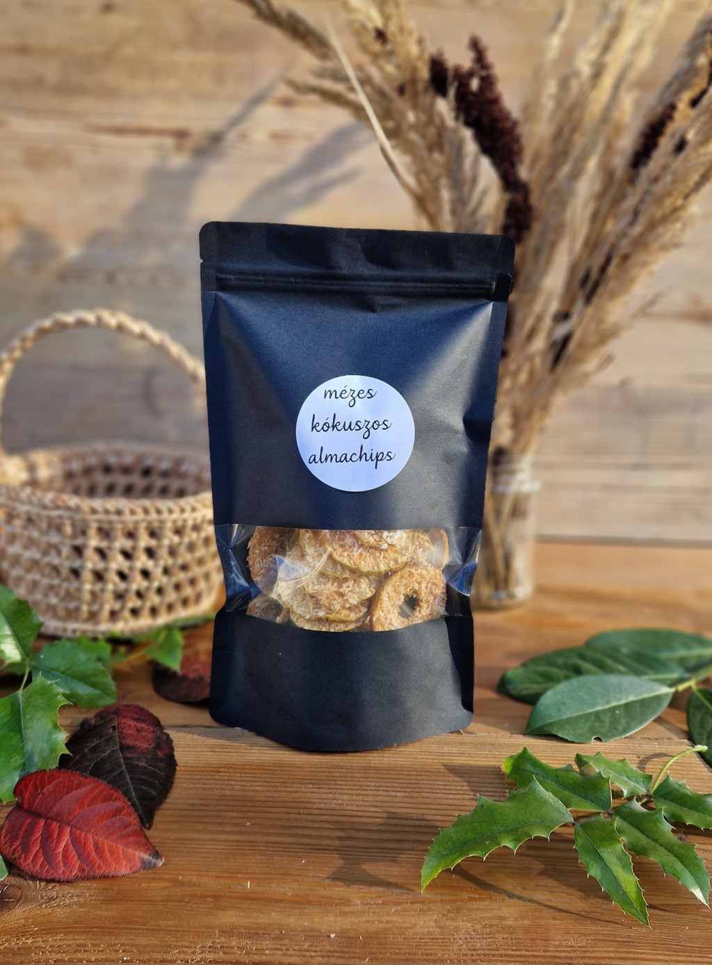 Mézes kókuszos almachips Egy ősi tartósítási módszer igazán modern köntösben: ezek a mi ropogós almachipseink.  Az almát mézzel és kókuszreszelékkel ízesítjük, ropogósra aszaljuk és visszazárható tasakba csomagoljuk, hogy ropogósságát sokáig megőrizze. Tárolása száraz, hűvös, hideg helyen, napfénytől védve! A csomag 120 gramm mézes kókuszos almachipset tartalmaz.