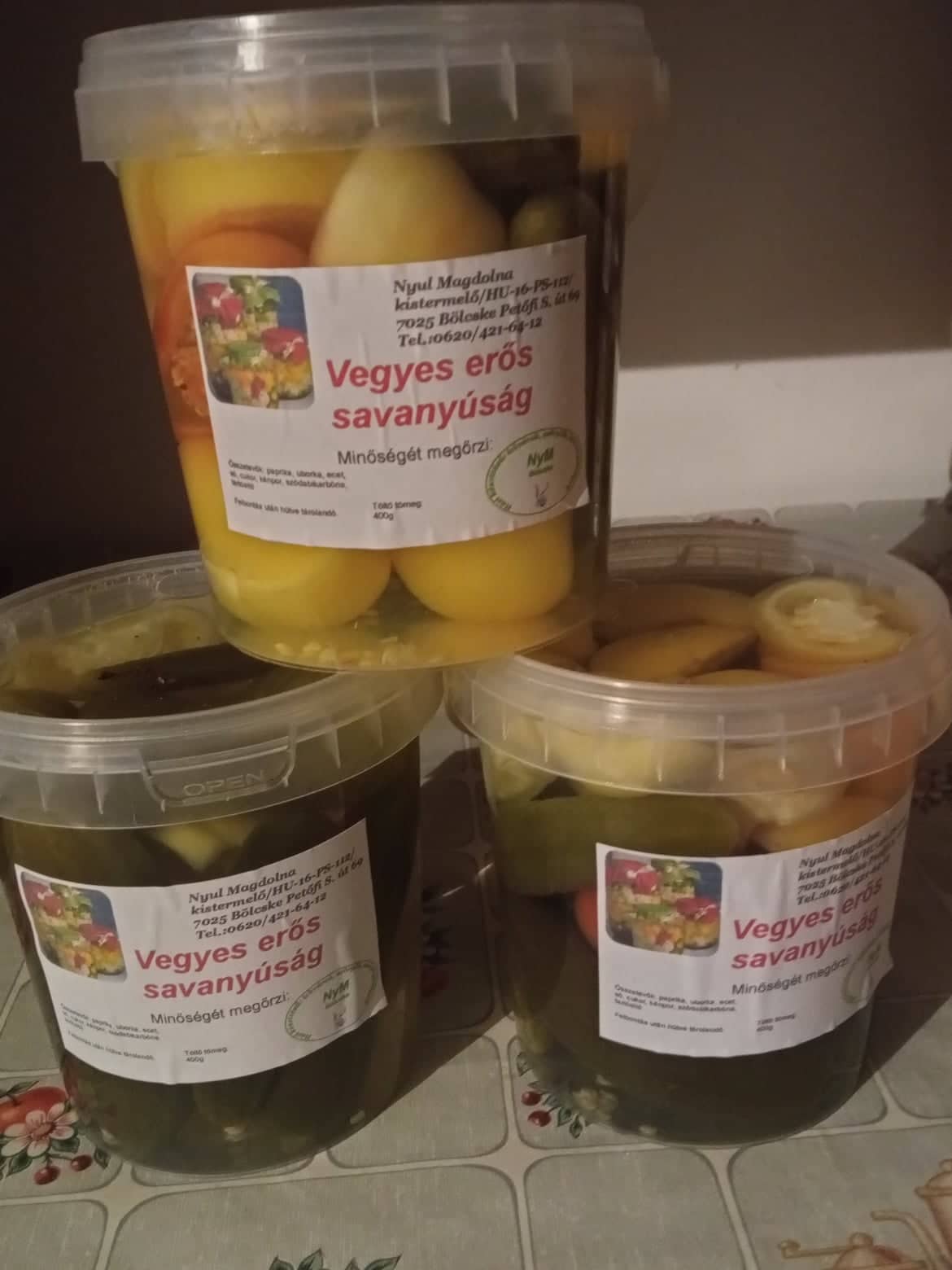 Összetevő: paprika, karfiól, uborka, ivóvíz, cukor, só, ecet, na-benzoat, borkén, szódabikarbóna
