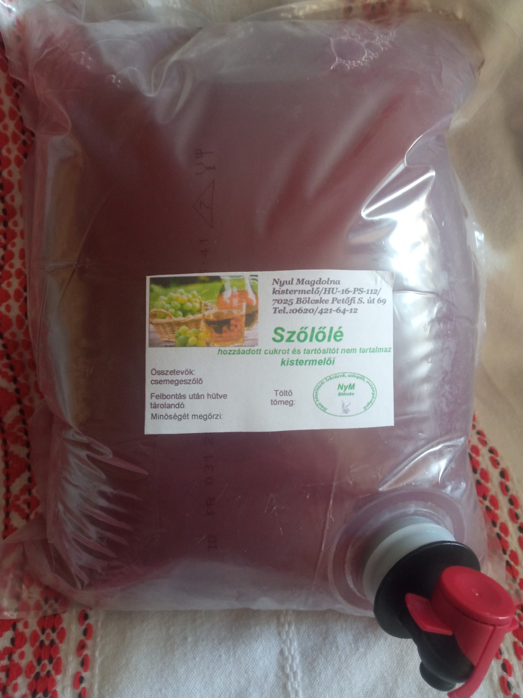 Saját gazdaságunkban termesztett csemegeszőlőből. Tartósítót, ízfokozót, cukrot nem tartalmaz. Hőkezeléssel tartósított. 3l-es csomagban.